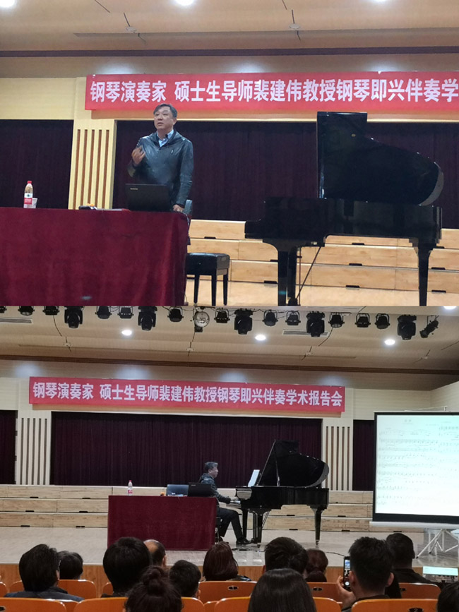 在讲座中,裴建伟教授分别从“钢琴即兴伴奏课程在音乐教育专业中的地位”、“钢琴功能特点”、“钢琴即兴伴奏必备条件”、“钢琴和声序进连接训练”、“钢琴织体学研究与伴奏音型训练”、“艺术歌曲中钢琴伴奏前奏、间奏、尾奏设计研究”等五个部分讲述了钢琴即兴伴奏学习和训练要点。作为师范音乐教育专业一门集合型课程——钢琴即兴伴奏课程,裴建伟教授深入阐述了“钢琴即兴伴奏”运用不仅是把大学中的音乐技术理论课程、音乐文化与史学课程、钢琴演奏技能课程等内容、知识集合表现,同时如何有创造力的演奏能力培养作为研究的核心问题提出了自己的观点和方法。裴建伟教授在几项内容讲述中做了大量演奏示范和实验性的演奏比较,通过实际演奏例证清晰准确说明问题,得到在场广大师生一致好评!